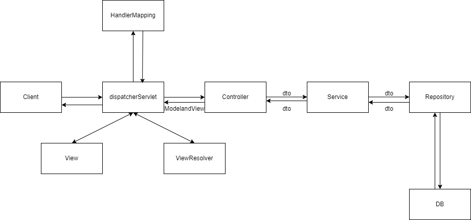 - 클라이언트에서 요청(URL)이 들어오면 DispatcherServlet이 요청을 받는다.
