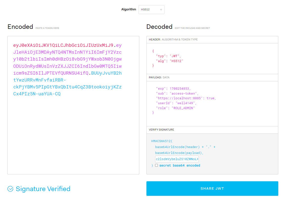 그리고 위의 토큰값을 https://jwt.io/에 들어와서 토큰값을 입력을 하면 토큰에 대한 정보를 확인을 할 수 있습니다.