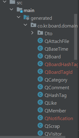 3-2.builde.gradle 내에서 query dsl에 관한 설정을 적어 준 뒤 build를 합니다. build가 끝나면 옆의 사진과 같이 Q가 붙어있는 클래스가 생성 되는 것을 볼 수가 있습니다.