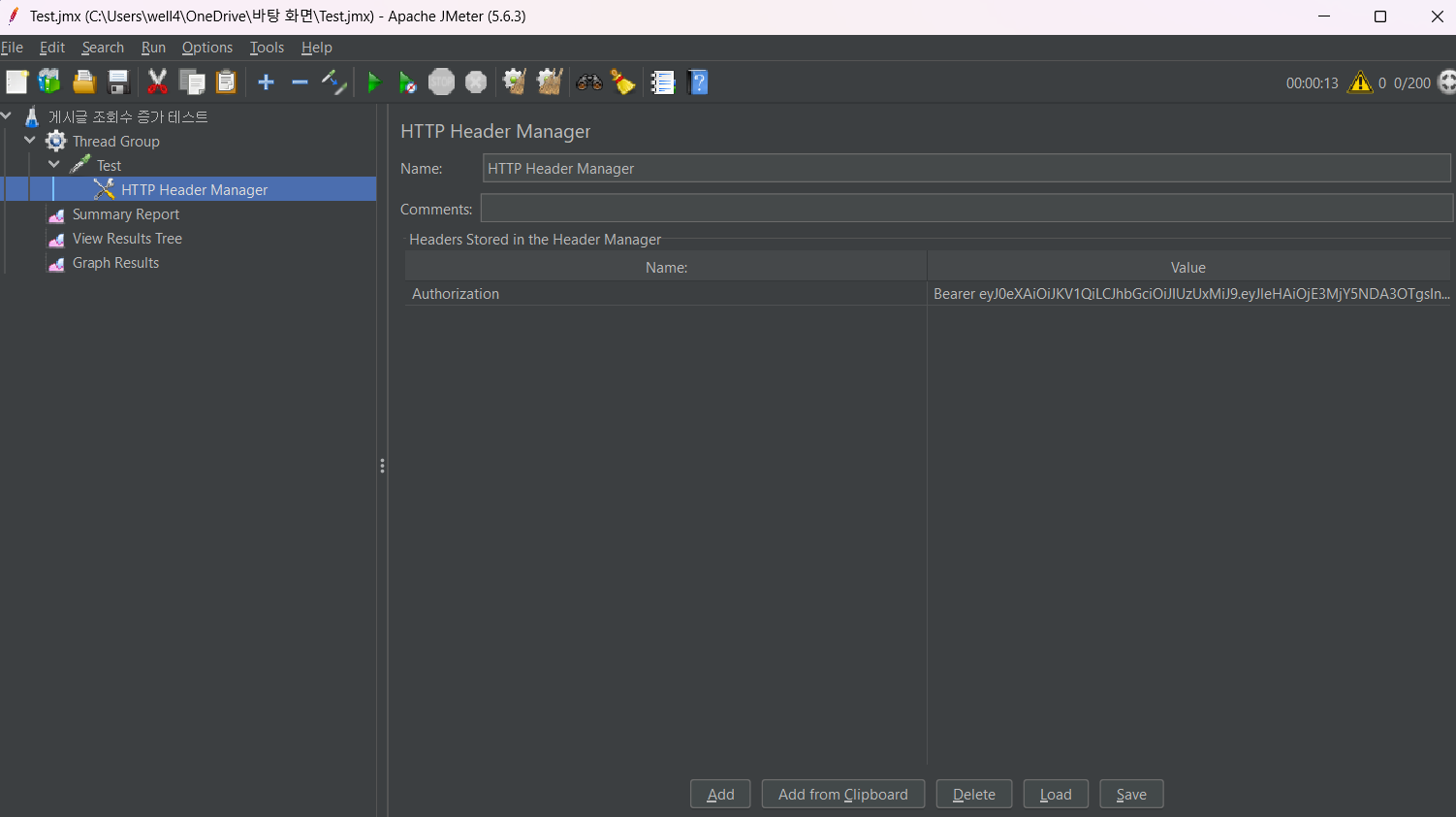 헤더에 추가를 하는 방법은 처음에 나온 테스트에 우클릭 -> add -> Config Elements -> Http Header Manager로 들어가시면 됩니다.