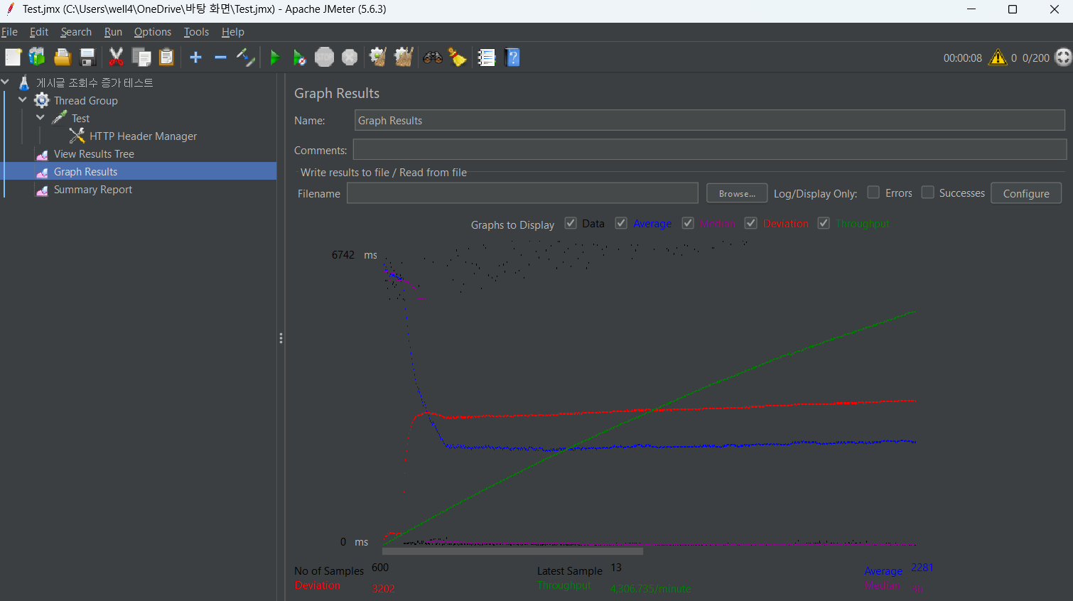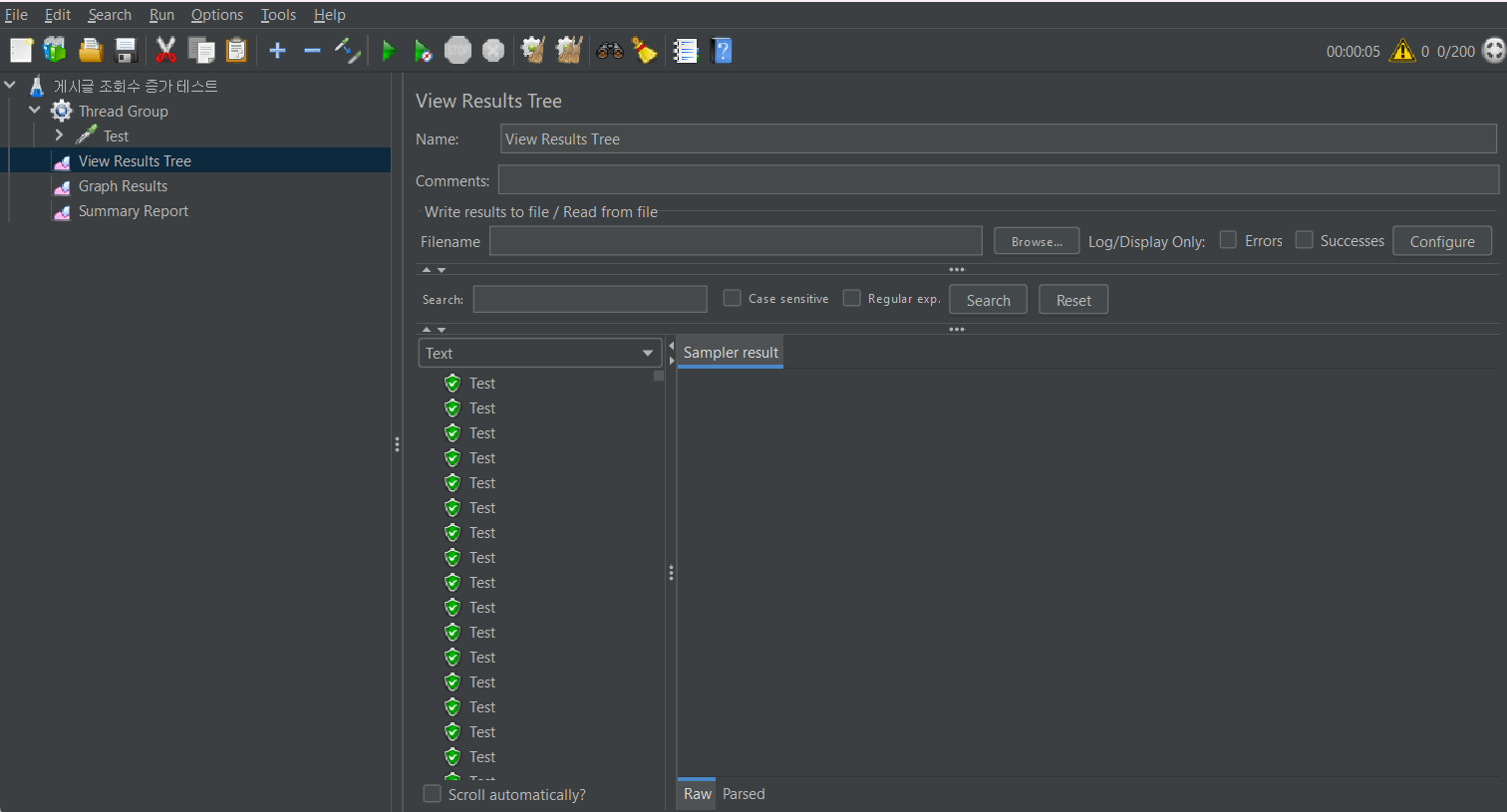 스레드의 수 (동시접속자)의 수는 200으로 설정을 했고 Loop Count 는 3번으로 해서 총 600번의 요청을 하도록 설정을 했습니다.