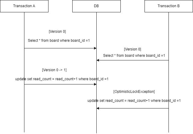 - T1에서 게시글의 조회수를 증가하는 쿼리를 실행후 커밋을 하면 version을 +1한다.