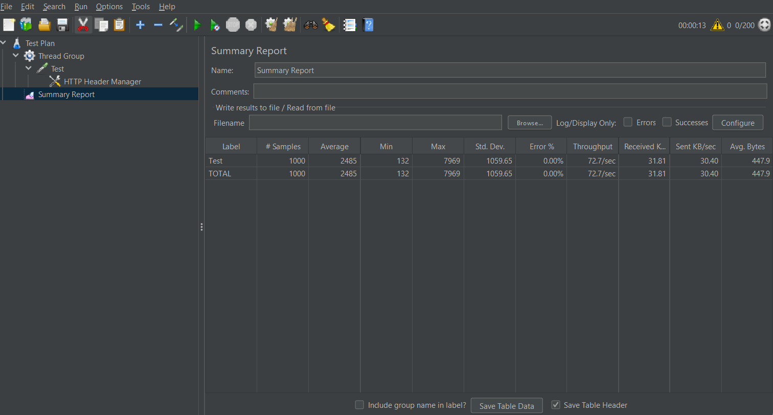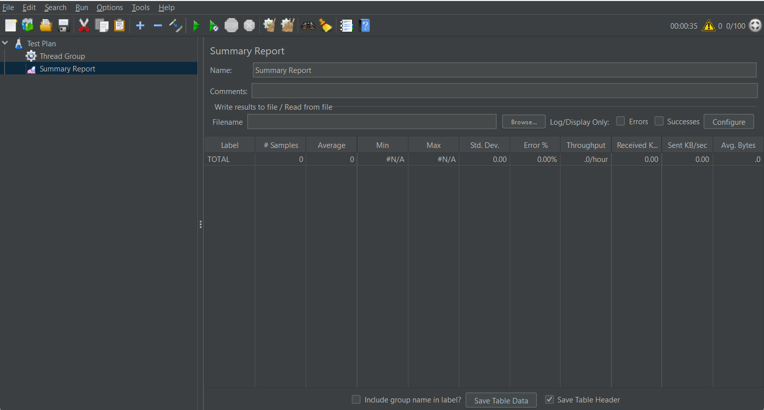 TestPlain 우클릭 -> Add 클릭 -> Listener클릭 -> SummaryReport를 클릭을 하면 다음과 같이 나옵니다.