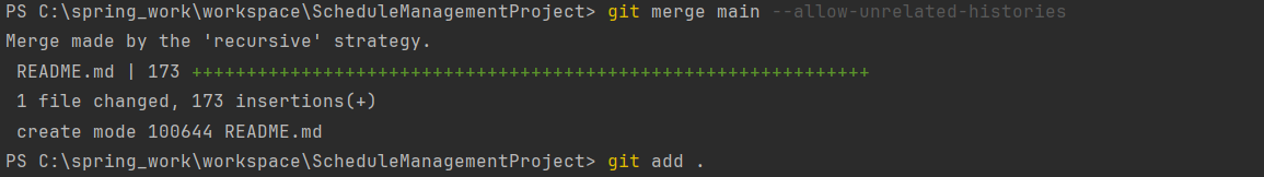 main 브랜치와 똑같이 feature에 --allow-unrelated-histories 를 사용해서 main브랜치와 merge를 실행해 주면 아래의 사진과 같이 됩니다.