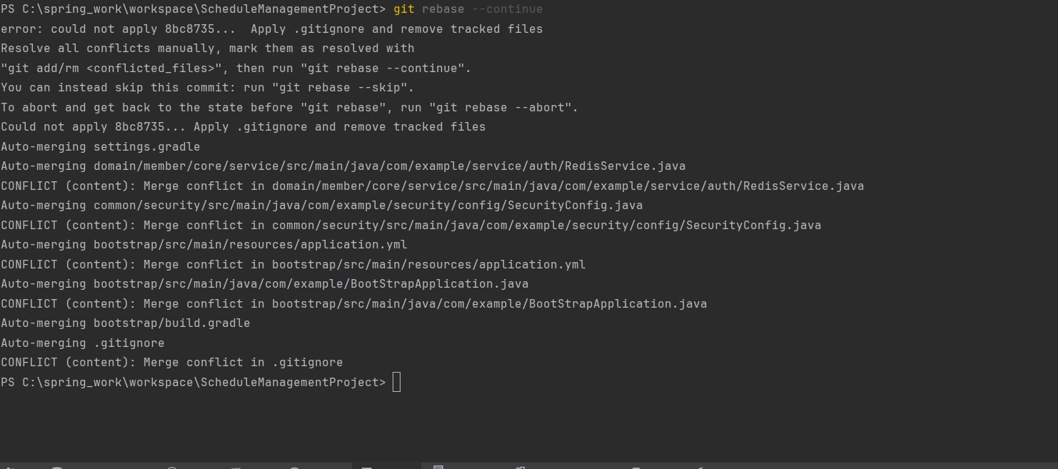 8. 그 다음 git rebase --continue로 충돌이 난 부분을 계속 작업을 합니다.