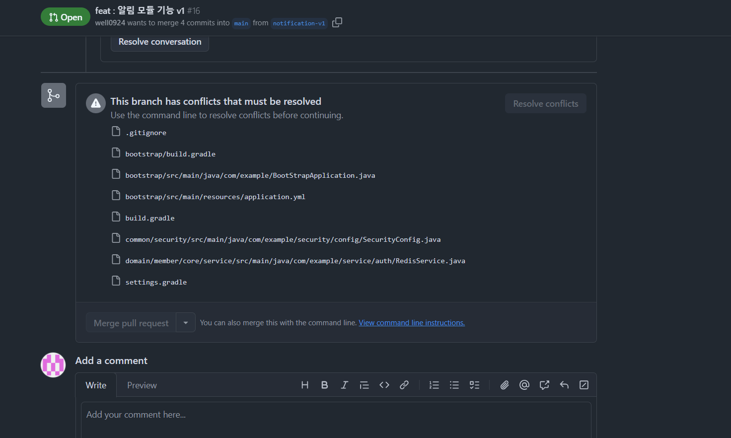 10. 마지막으로 PR 깃허브가서 충돌이 났는지를 확인하고 충돌이 안났으면 머지를 누릅니다.