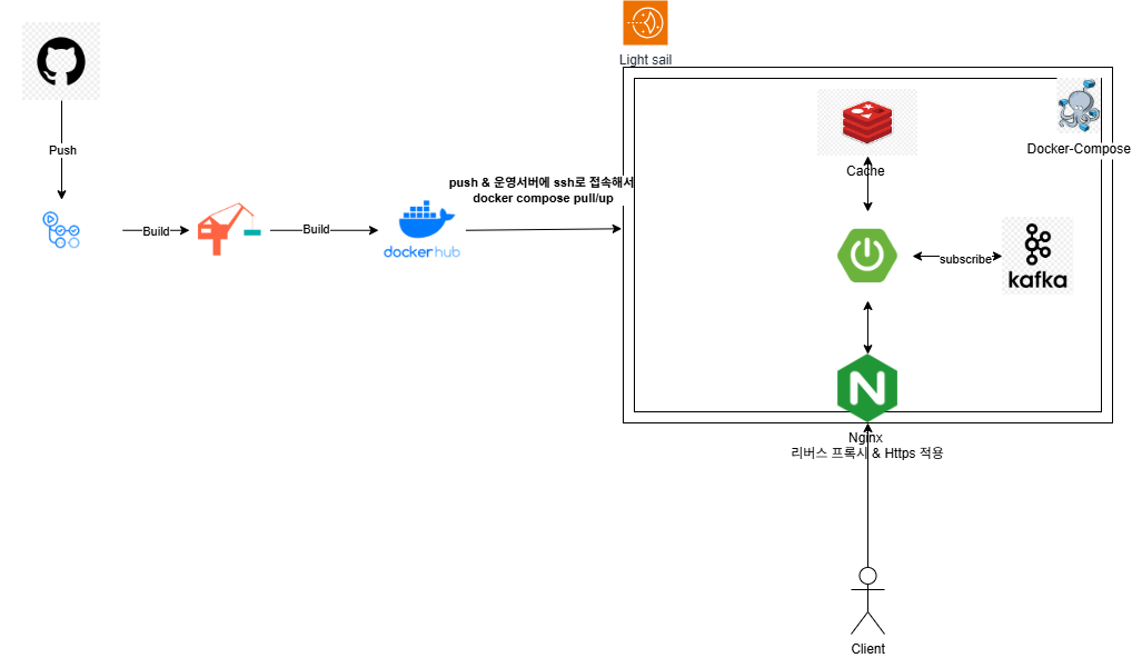 Github Actions에서 Docker 이미지를 빌드한 후, Amazon Lightsail 서버에 자동으로 배포되는 구조를 만들었습니다.