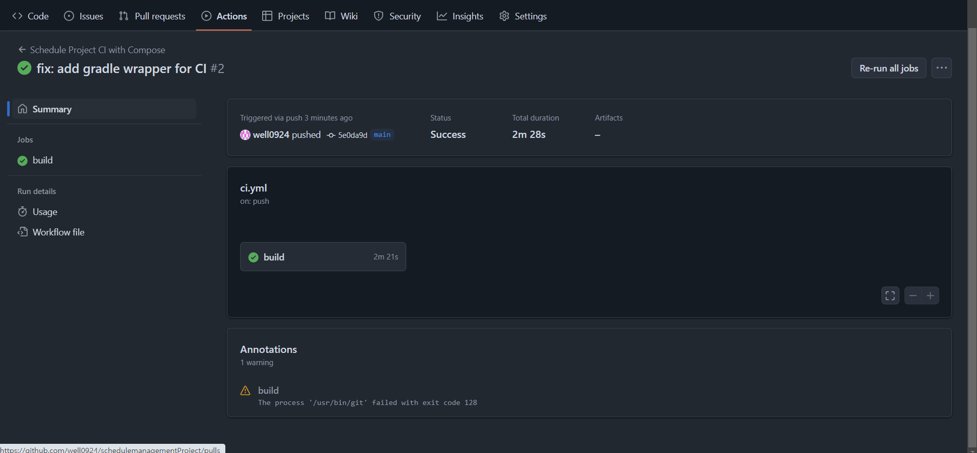main브랜치에 푸쉬를 했고 CI가 작동이 되었는데 아래와 같은 화면이 나왔습니다.