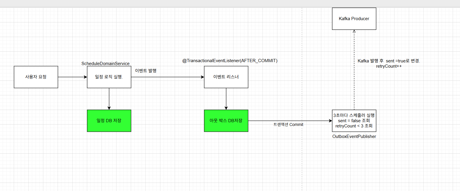 - 일정 DB와 Outbox 저장은 같은 트랜잭션 내에서 처리됩니다. (다이어그램 초록색 영역)