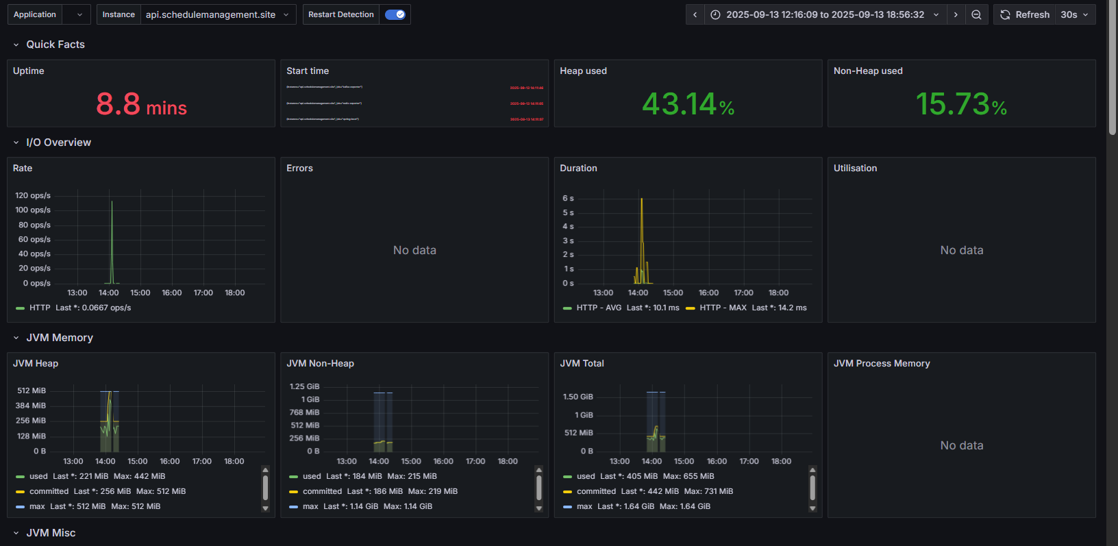 - Grafana (Prometheus 연동): JVM Heap, GC, DB 커넥션 풀 등 서버 내부 지표 모니터링