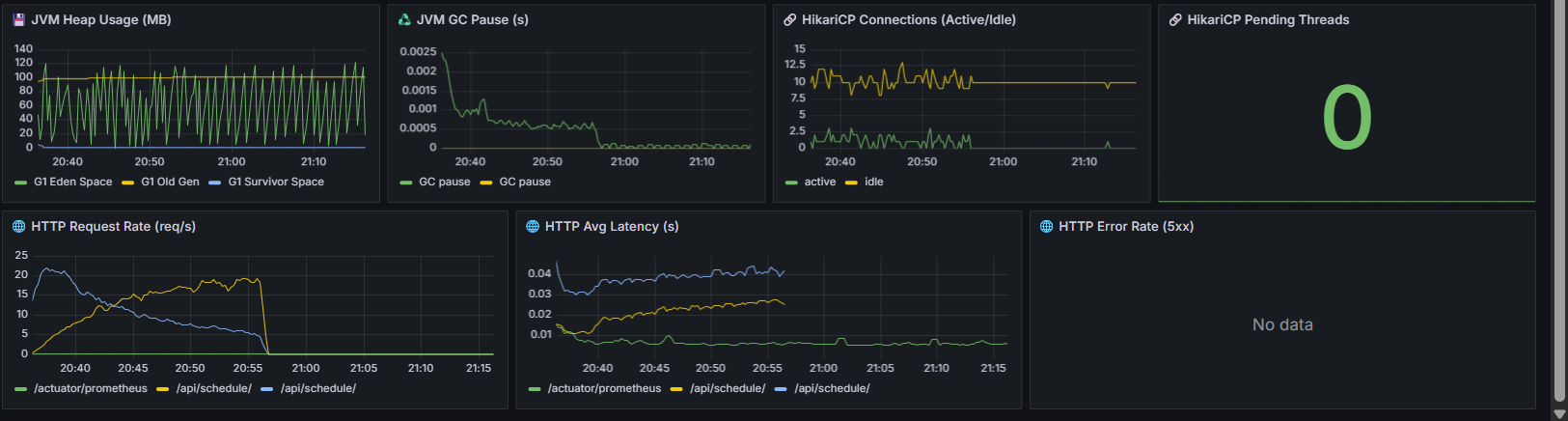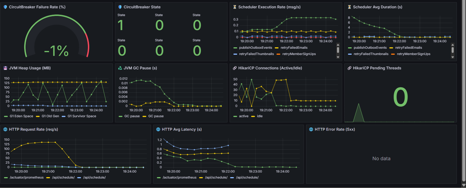 - HikariCP Active/Idle 커넥션: 정상 범위 유지 (최대 풀을 쓰더라도 Pending Threads 없음-> 대기열 병목 없음)