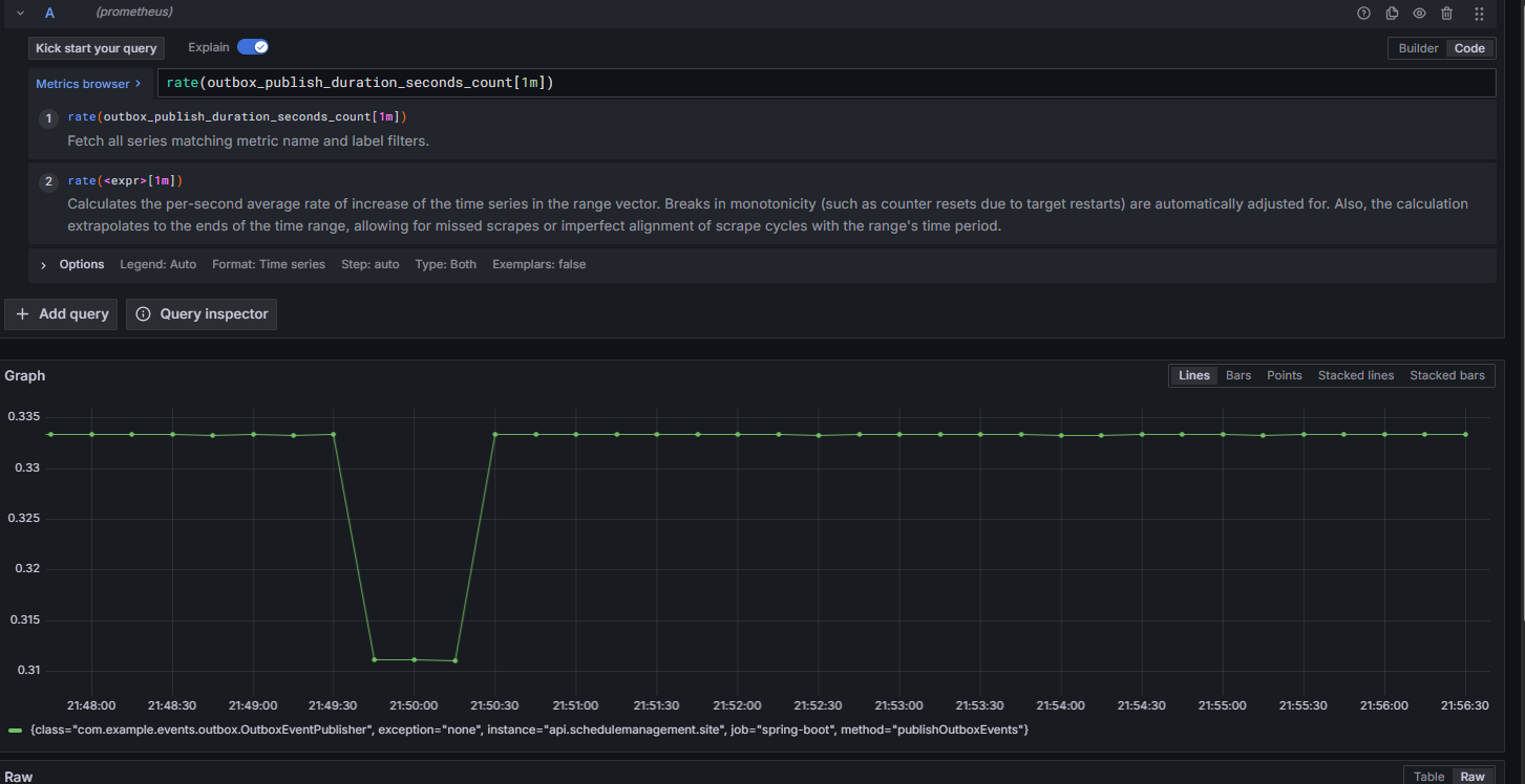 - Outbox Publish Rate: ~0.3 msg/s 안정적으로 유지 (스케줄러 기반 publish)