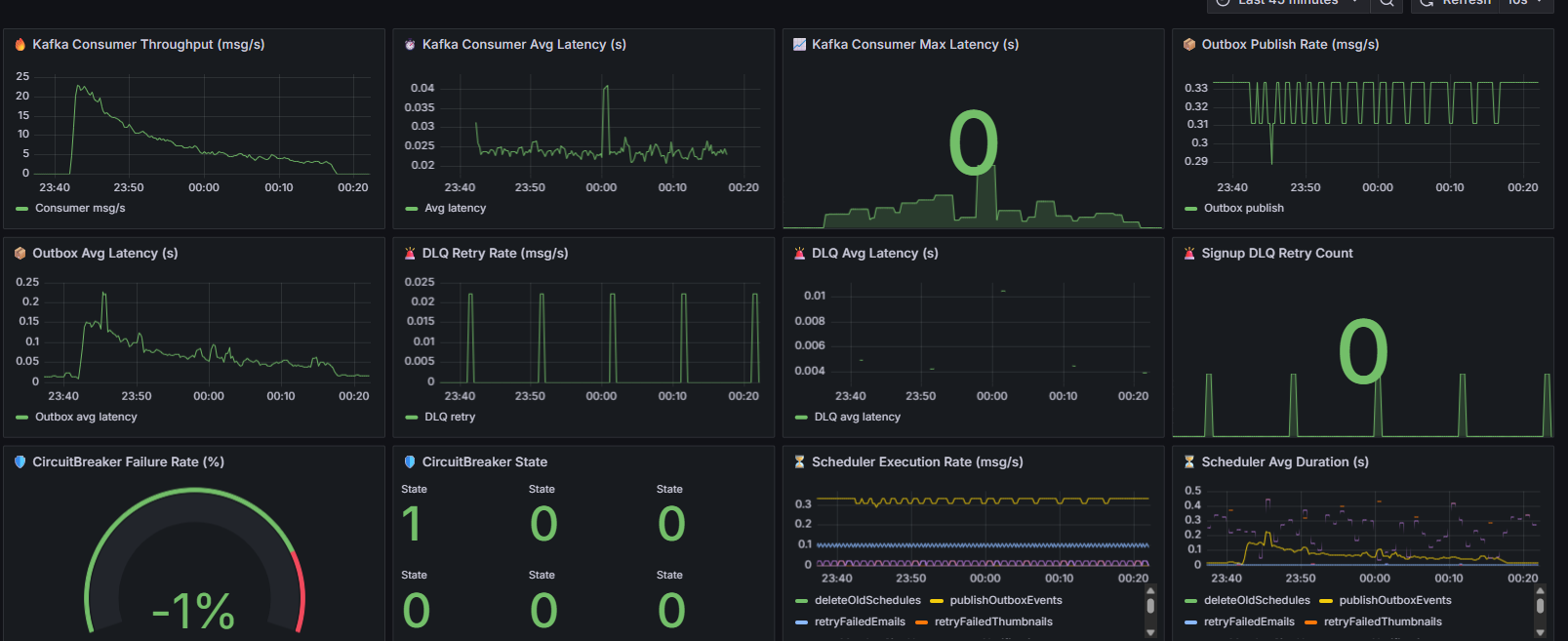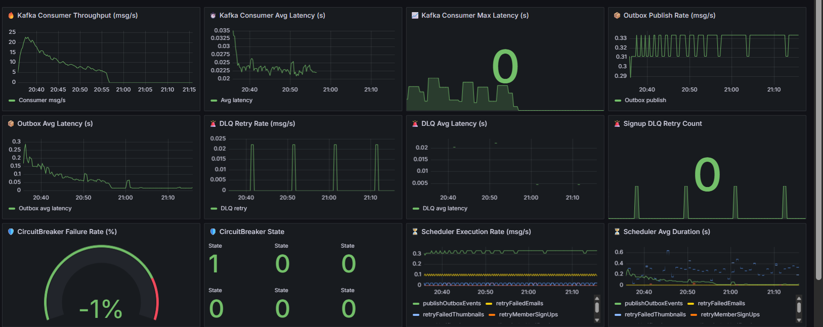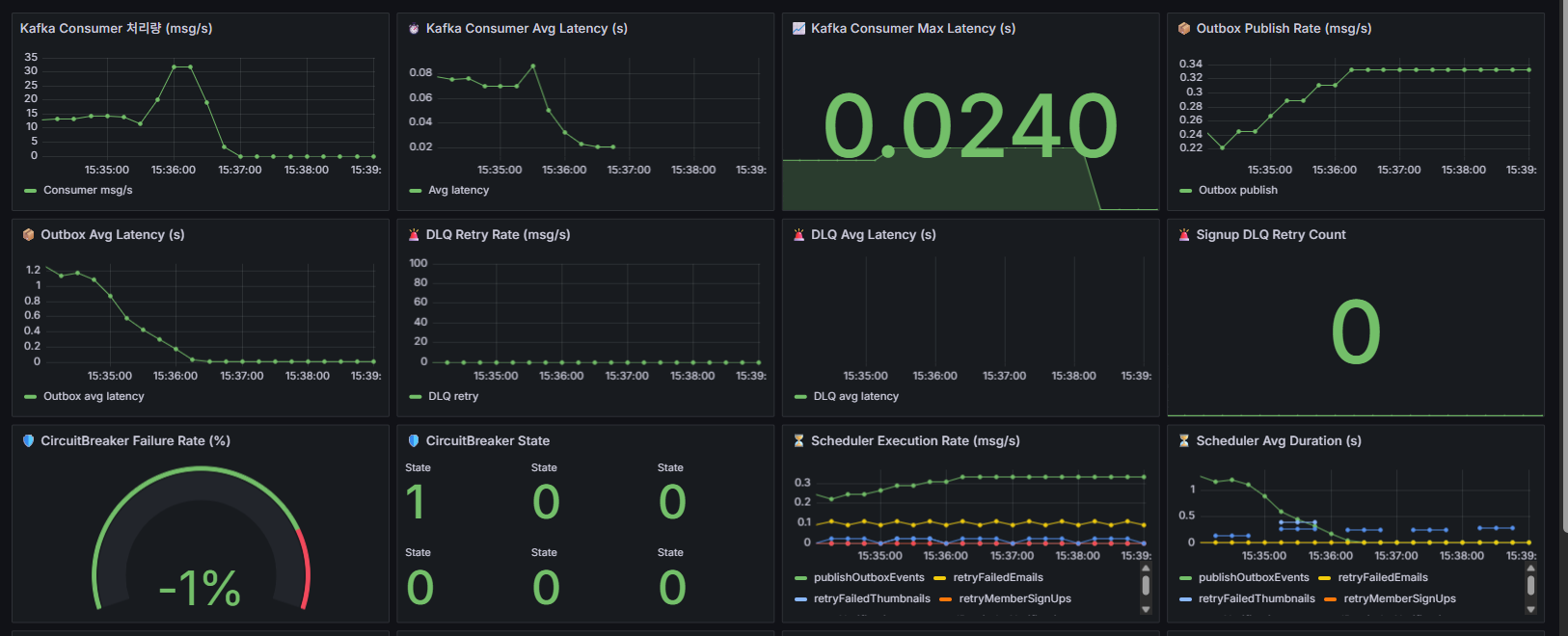 - Outbox Avg Latency: 초반 스파이크 있었으나 0.05~0.1s 수준으로 안정화