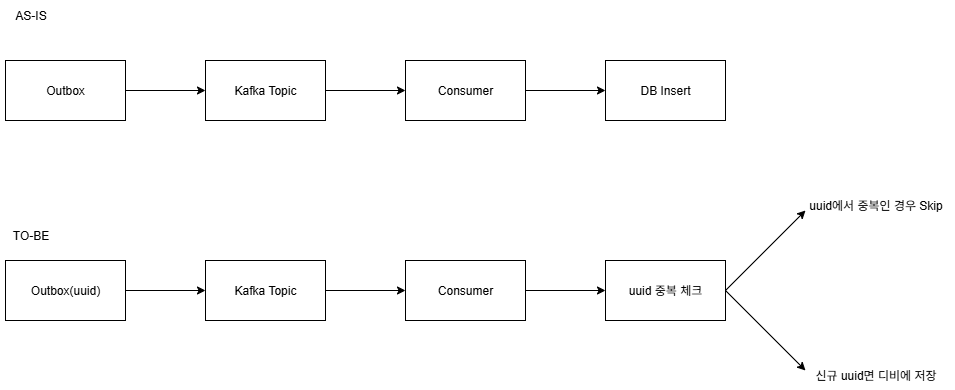 예를 들어, 회원가입 이벤트가 중복 처리되면 동일한 회원이 여러 번 insert되거나, 알림 이벤트가 중복 발송될 수 있습니다. 메시지 유실은 막았지만, 중복 처리로 인한 데이터 정합성 문제가 여전히 발생할 수 있다는 뜻입니다. 그래서 이러한 현 구조를 개선을 하기 위해서는 exactly-once를 적용을 해기로 했습니다.