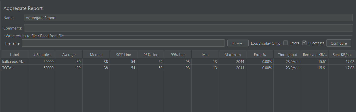 5만건 요청에도 유실 0건, 중복 0건 최종적으로 디비에 1.7만건을 정상 저장을 했고 응답 시간 평균은 39ms,에러율은 0%로 Kafka EOS 멱등 처리(evnetId 기반) 보장이 검증이 된것을 알 수가 있습니다.