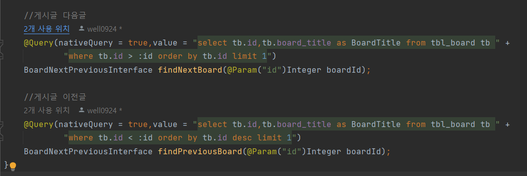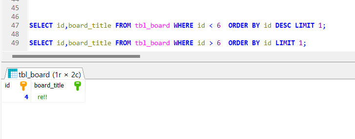 자유게시판에서 상세조회 페이지에서 이전글/다음글을 보여주는 기능을 만드는 중에서 repository에 만들어 놓은 쿼리에서 실행을 할 때 데이터 베이스 상에서 쿼리를 작성해서 실행을 하면 사진과 같이 정상적으로 작동이 되었지만 막상 실행을 하면 아래와 같은 에러가 발생.