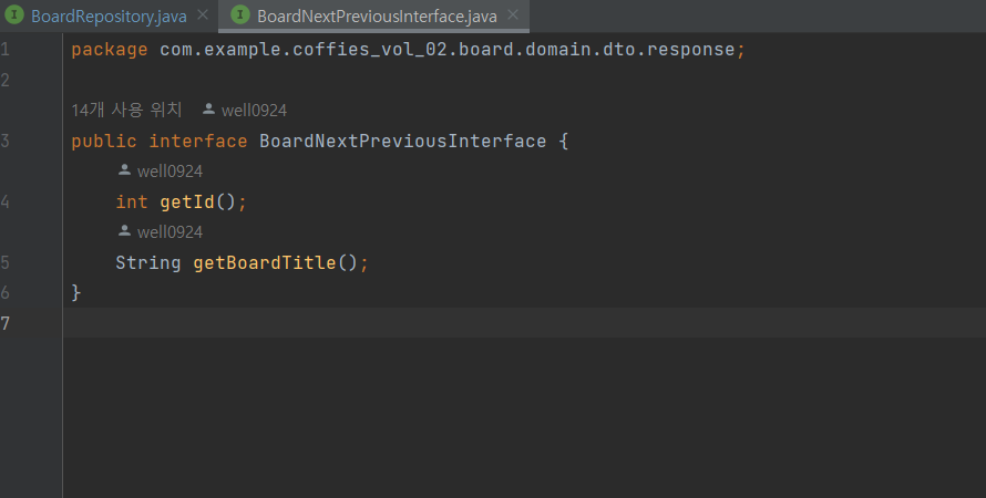 2. Repository에서 쿼리를 작성을 할때 조회할 컬럼에 별칭을 넣어서 인터페이스에 있는 변수명과 동일하게 맞춰준다.