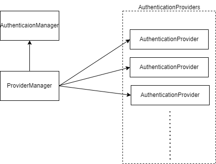 AuthenticationManager는 AuthenticationFilter에서 생성한 인증객체를 위임을 받아서 실제 인증역할을 담당하는 AuthenticationProvider(들)에게 위임하는 역할을 하고 있다.