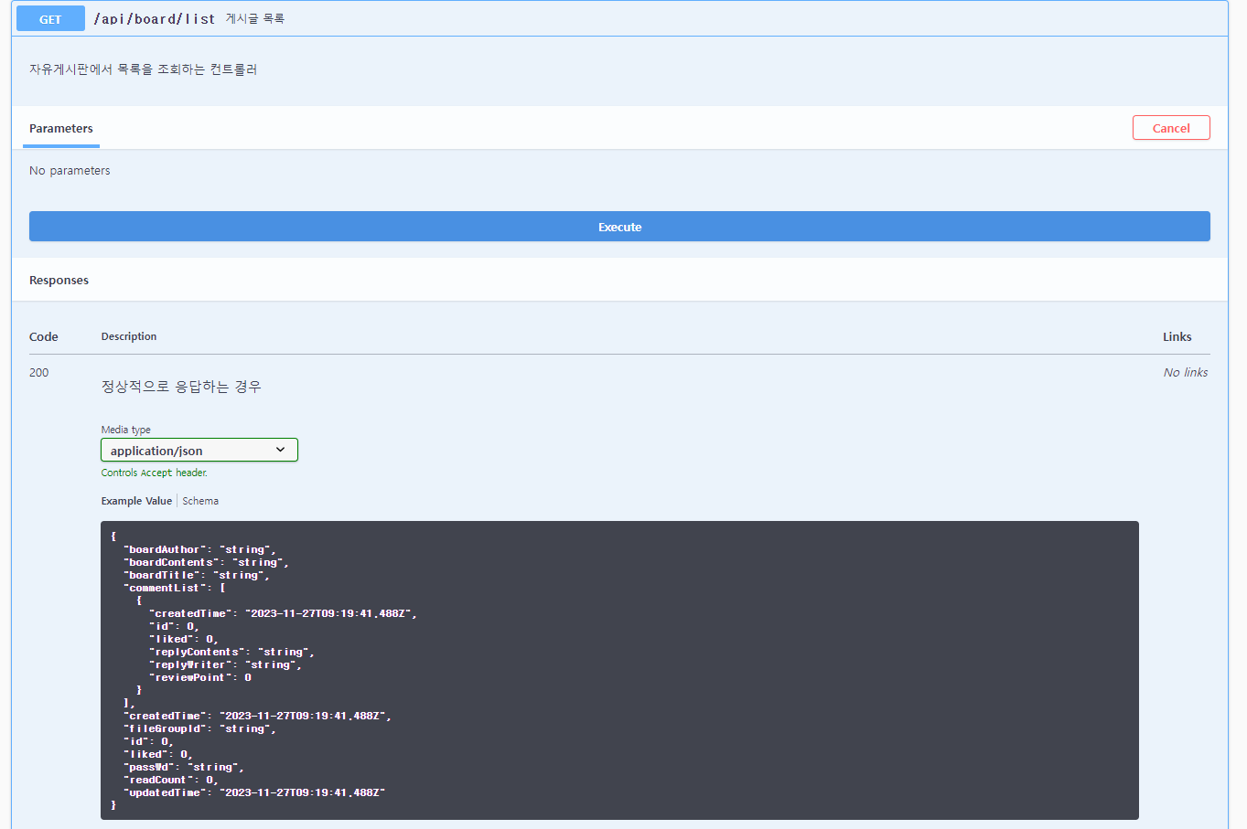@Operation(summary = "게시글 목록", description = "자유게시판에서 목록을 조회하는 컨트롤러", responses = {