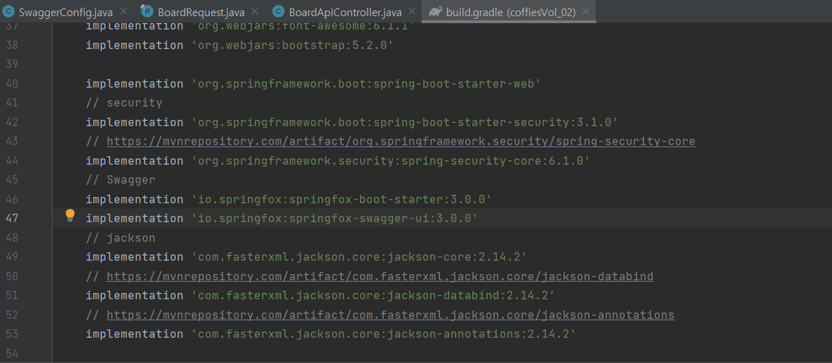 우선 사진과 같이 스프링 프로젝트에 라이브러리를 gradle에 넣는다.