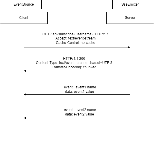 SSE의 기본적인 흐름은 클라이언트가 SSE요청을 보내면 서버에서는 클라이언트와 매핑되는 SSE 통신객체를 만들고(SseEmitter) 해당객체가 이벤트 발생시 eventsource를 client에게 전송하면서 데이터가 전달되는 방식입니다. sseemitter는 SSE 통신을 지원하는 스프링에서 지원하는 API입니다.