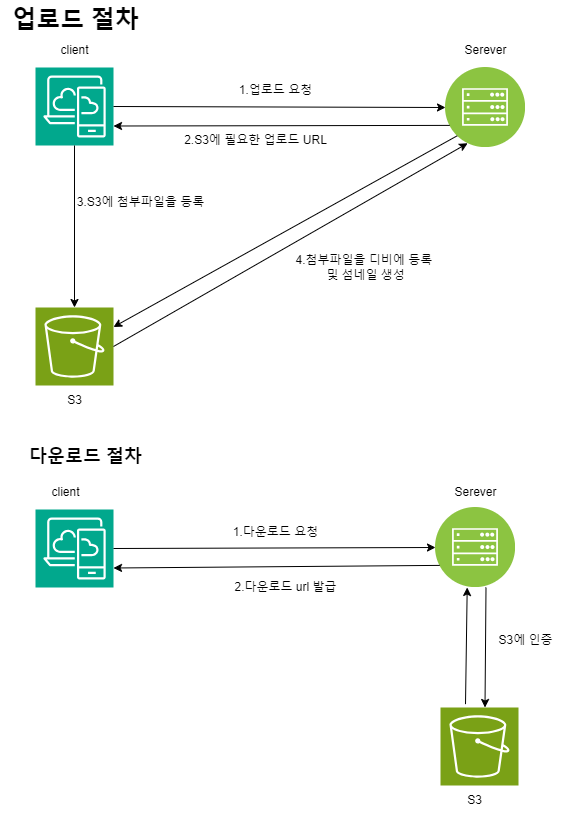 우선은 지난 글에서 기존의 첨부파일의 로직의 단점을 설명했고 이번에는 S3를 활용한 PreSignedUrl을 구현해보겠습니다. 아래의 도식은 제가 작성한 업/다운로드의 흐름도 입니다.
