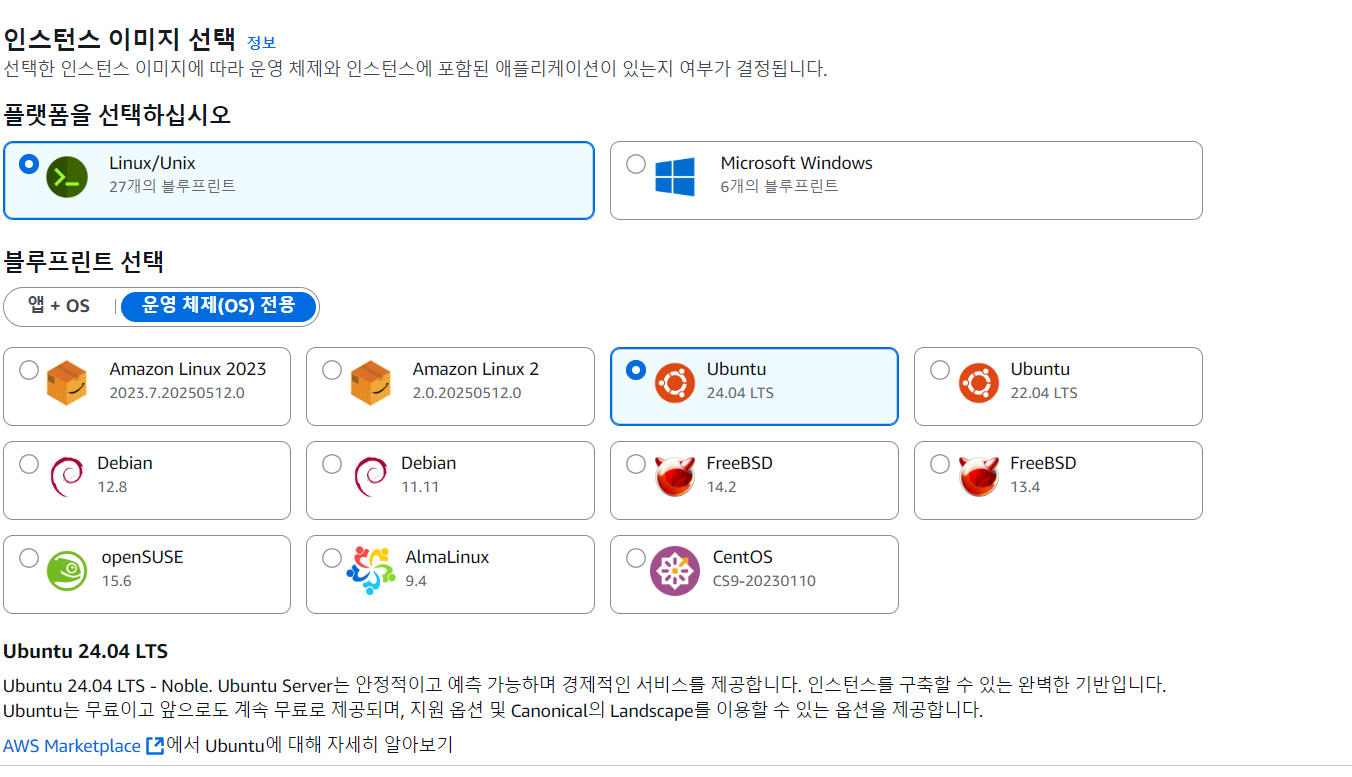 - 플랫폼: "Linux/Unix", 블루프린트: "OS Only" > Ubuntu 24.04 선택