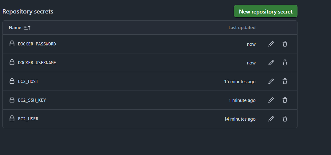 그 다음에 New Secret Repository를 누른후 도커 허브에 들어가는 아이디, 비밀번호, 라이트세일의 IP, 서버이름(mobaxterm에 작성한 이름), SSH .pem key를 입력을 하고 아래와 같이 합니다.