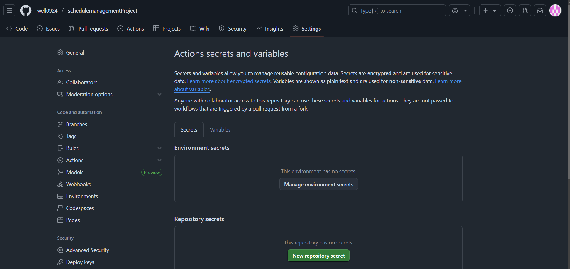이 다음에는 Github에 들어가서 CD를 하기 위해서 Secret을 입력을 해야합니다. 우선은 Git 리포지터리에 들어간다음에 Settings에 들어간후 Secrets and variabes로 들어갑니다. 들어가면 아래와 같은 화면이 나옵니다.