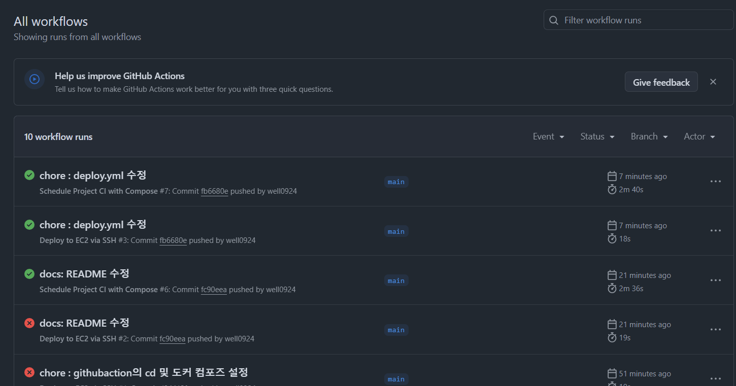 이제 테스트를 하기 위해서 main브랜치에서 readme를 수정해서 올리면 github의 Action에서는 아래와 같이 작동을 합니다.