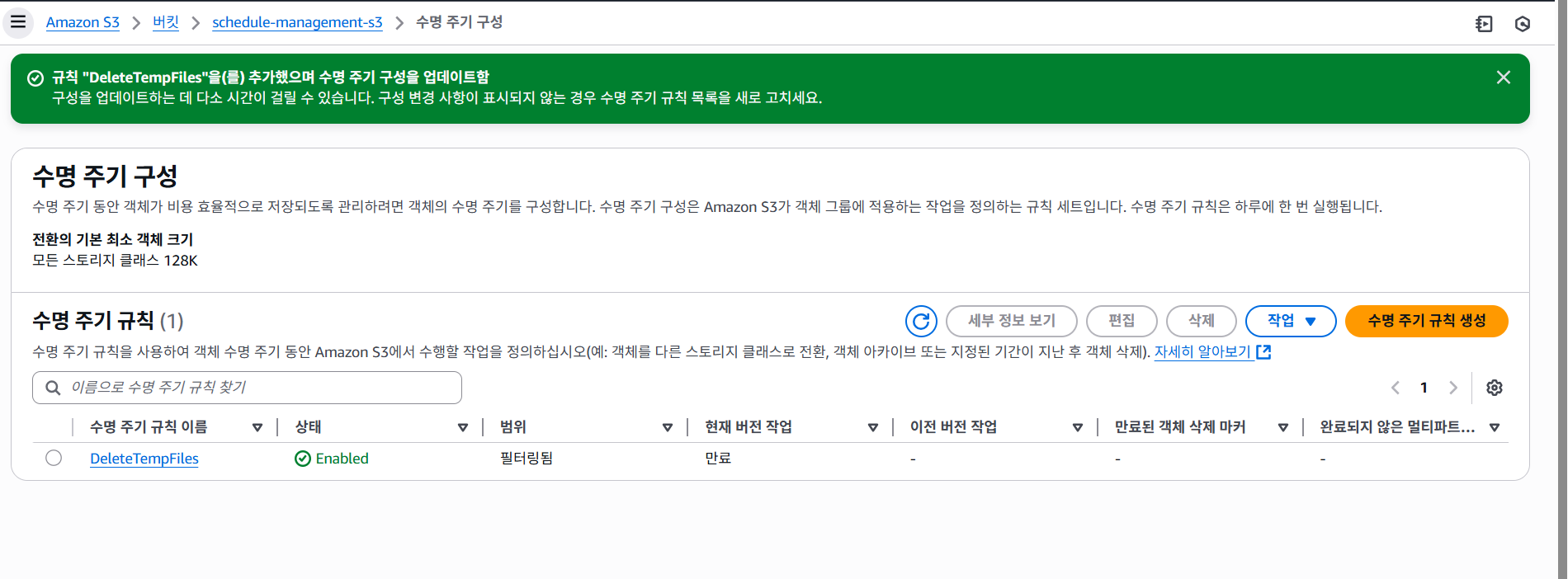 /temp/ 경로에 존재하는 파일 중, 일정 시간(예: 1일) 이상 미사용된 파일은 자동 삭제되도록 S3 Lifecycle 정책을 설정합니다.
